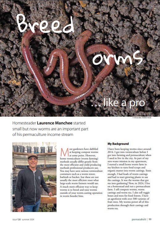 I have been keeping worms since around 2014. I got into vermiculture before I got into farming and permaculture when I used to live in the city. As part of my zero-waste mission in my apartment, I started a small home worm farm in my kitchen to turn food scraps and organic matter into worm castings. Soon enough, I had loads of worm castings and had to start growing plants to use the castings. It was the worms that got me into gardening! Now, in 2024, I live on a homestead and run a permaculture farm. I sell compost worms, worm castings and worm tea. I also sell veggie boxes and trees for food forests. I have an agroforest with over 300 varieties of fruit trees. My worms power all of this production through their castings and worm tea.