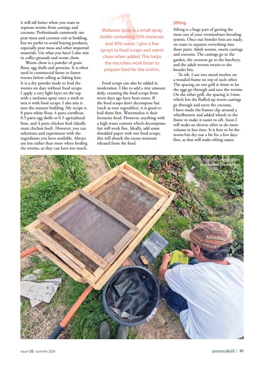 2. Worm castings from a vermicompost system are the same as the humus you would get on a forest floor. This is the best organic fertiliser you can get for your garden. 10% of my potting mixes are worm castings. A pinch goes under every veggie I plant, followed by a handful every few weeks. I also use a few handfuls for each tree I plant and then half a bucket each spring. The castings help build soil structure and support living soil. I aim to turn all my compost and organic waste from other areas of the farm into worm castings.