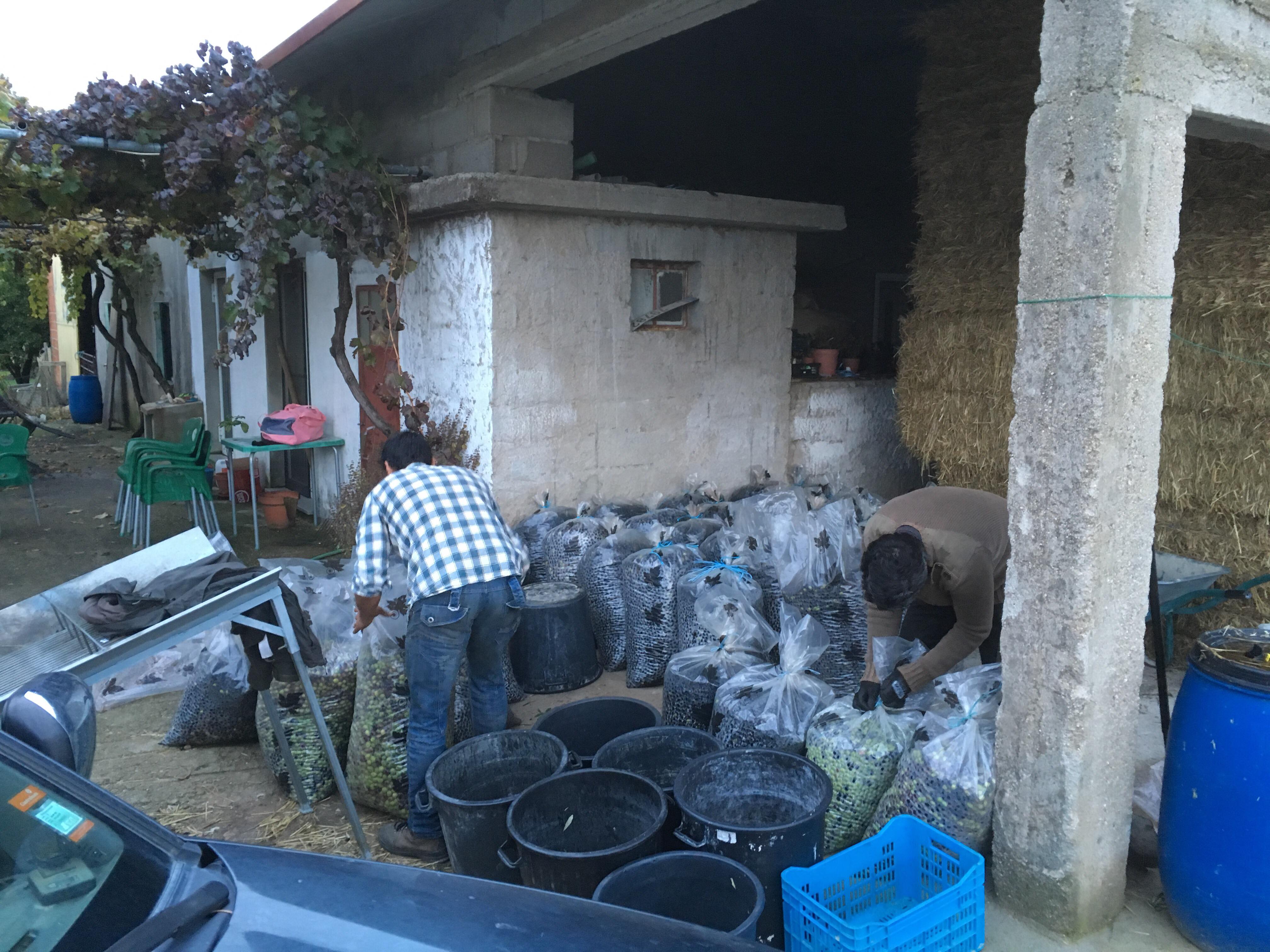 This is the whole harvest that we collected with an average of 10 people per day over 16 days. This gave a total of 1500kg of olive oil which made around 150 litres of olive oil. THe quality of the olives and the time they are harvested can drastically increase or decrease the amount of oil that you receive. All the olives go into transparent bags to then go to the lugar (olive oil press)