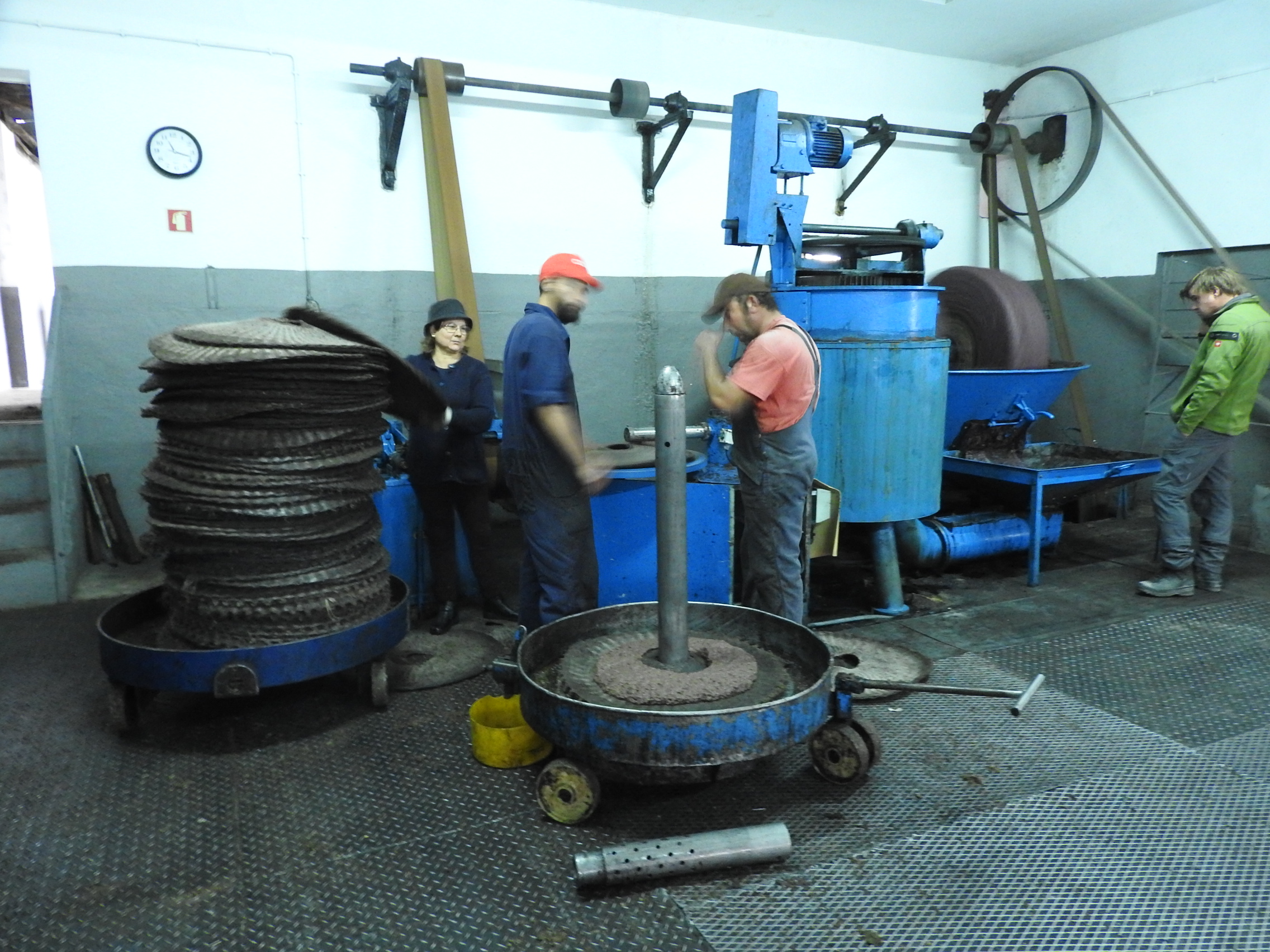 At the lugar they load the olives into the mill. These giant stone wheels spin and crush the olives into a pasteThe olive paste then gets spread around this round fabric and then many of them are piled up like a huge stack of pancakes ready for pressing. These then go into a machine where they get compressed and an oil drips out