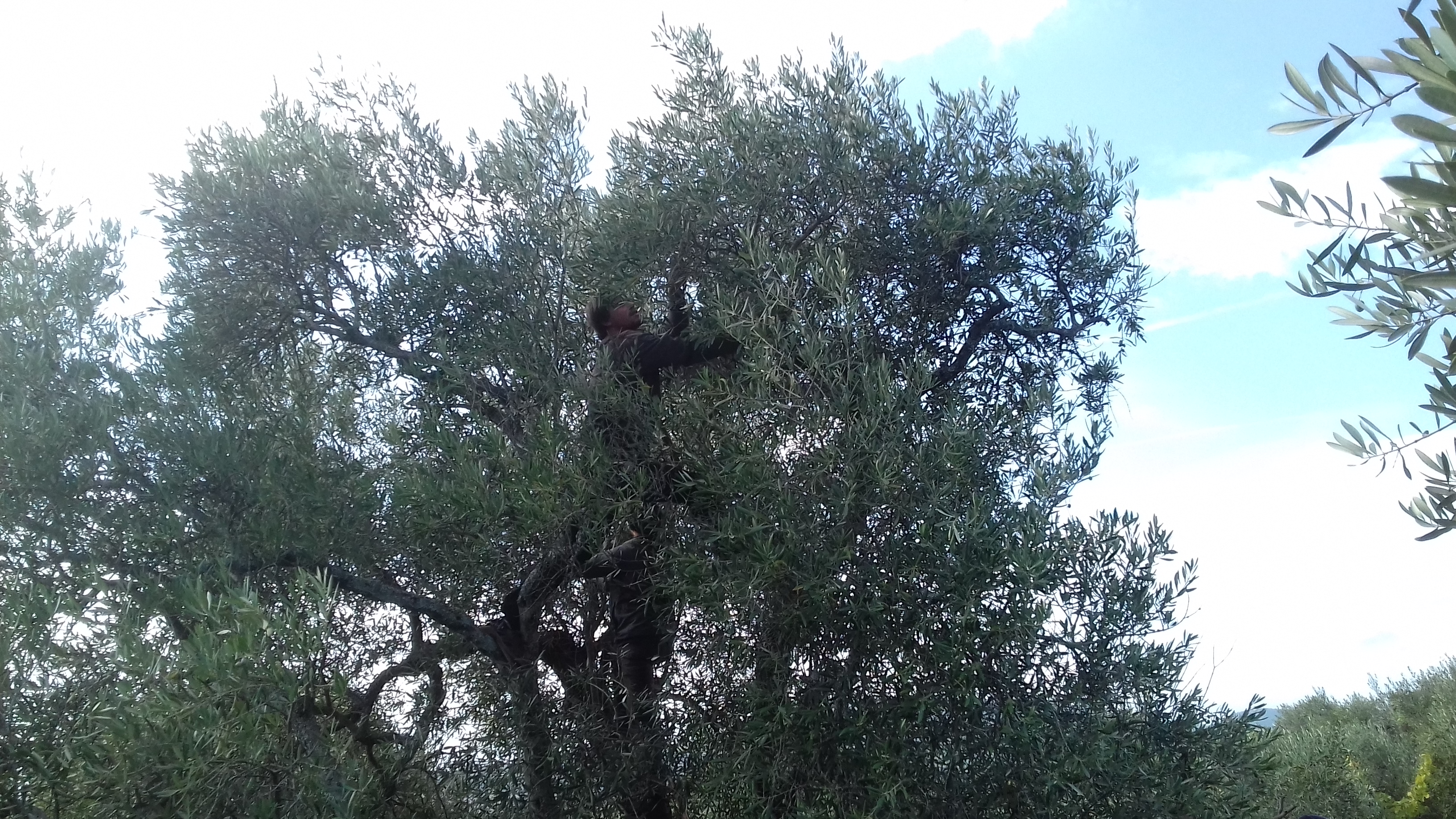 Apart from actually picking olives, we had to prune the olive trees earlier in the year. This was to encourage the tree to grow as we wanted it to. Our 40 olive trees are located in various places around the farm, some are old and some we planted. The older ones needed a heavy prune as they have been left alone for many years. Following this, we had to clear the grass, brambles and other plants from under the trees to give us access to harvest.