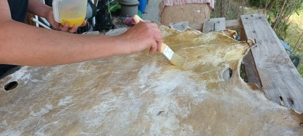 - Paint the skin with a treatment real thin. We use a homemade blend of 1/3 egg yolk, 1/3 olive oil, 1/3 water and a slash of homemade soap.