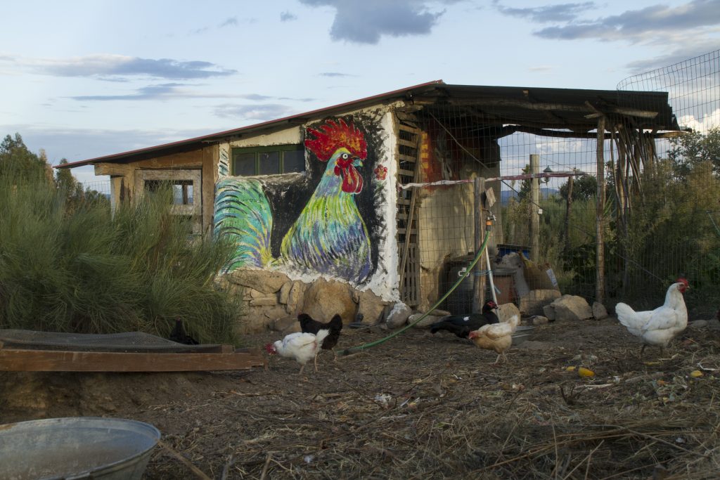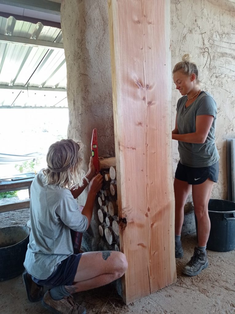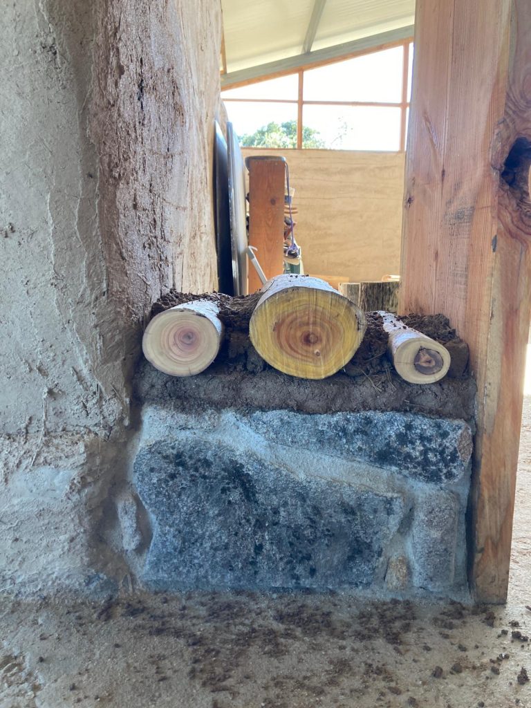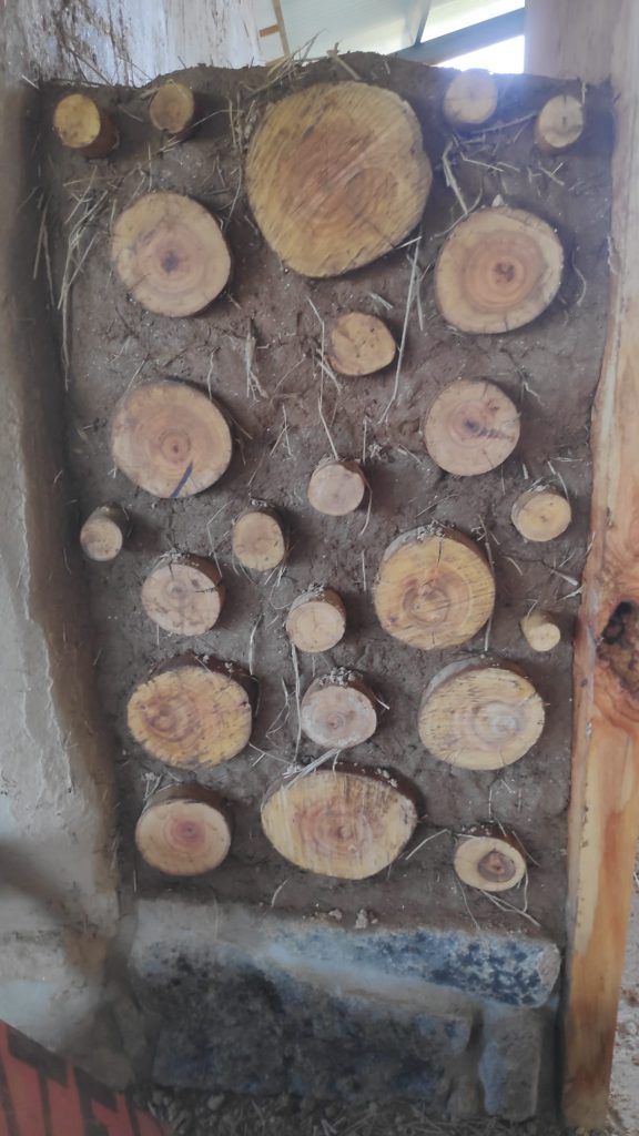 Cordwood is my favourite method as it only uses materials from our land. The timber is from dried eucalyptus trees, stone foundation from the fields and clay from the land. It gives a thick wall with a beautiful effect. On top of that, it is very easy to build.