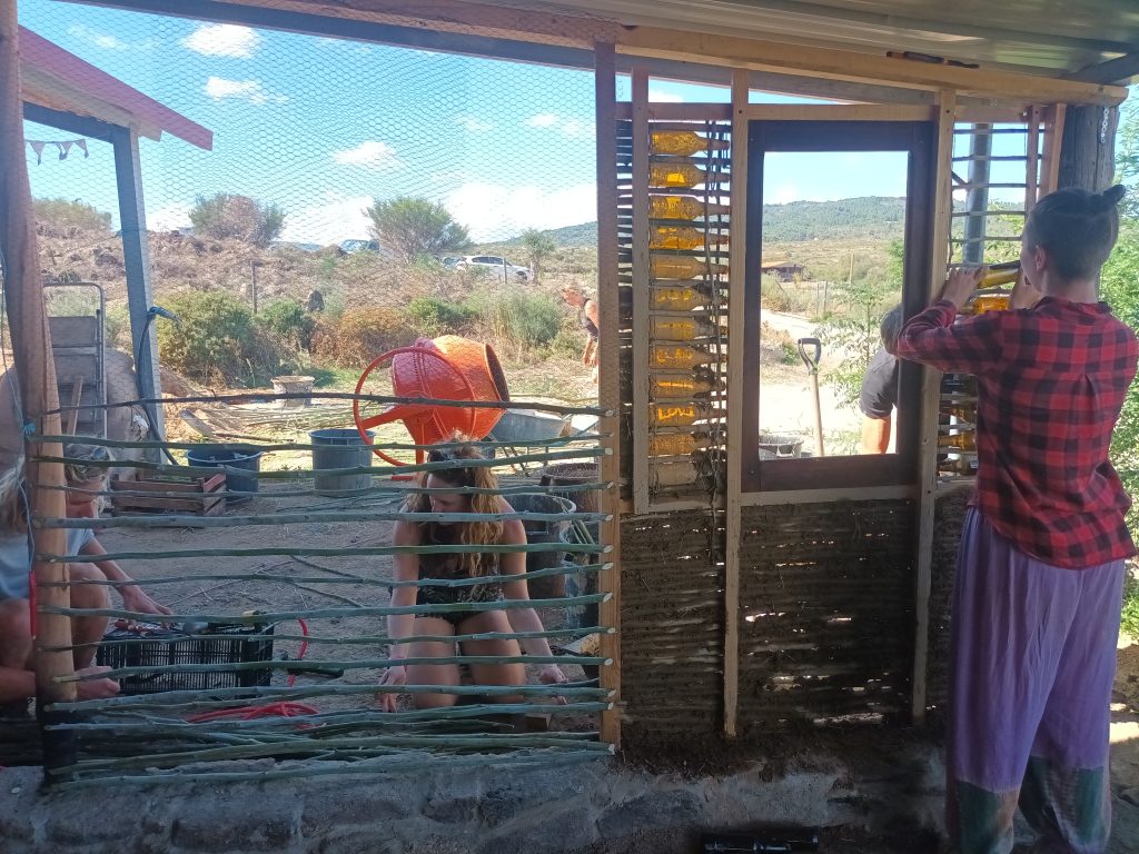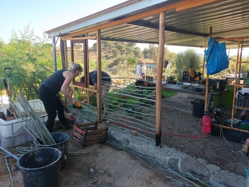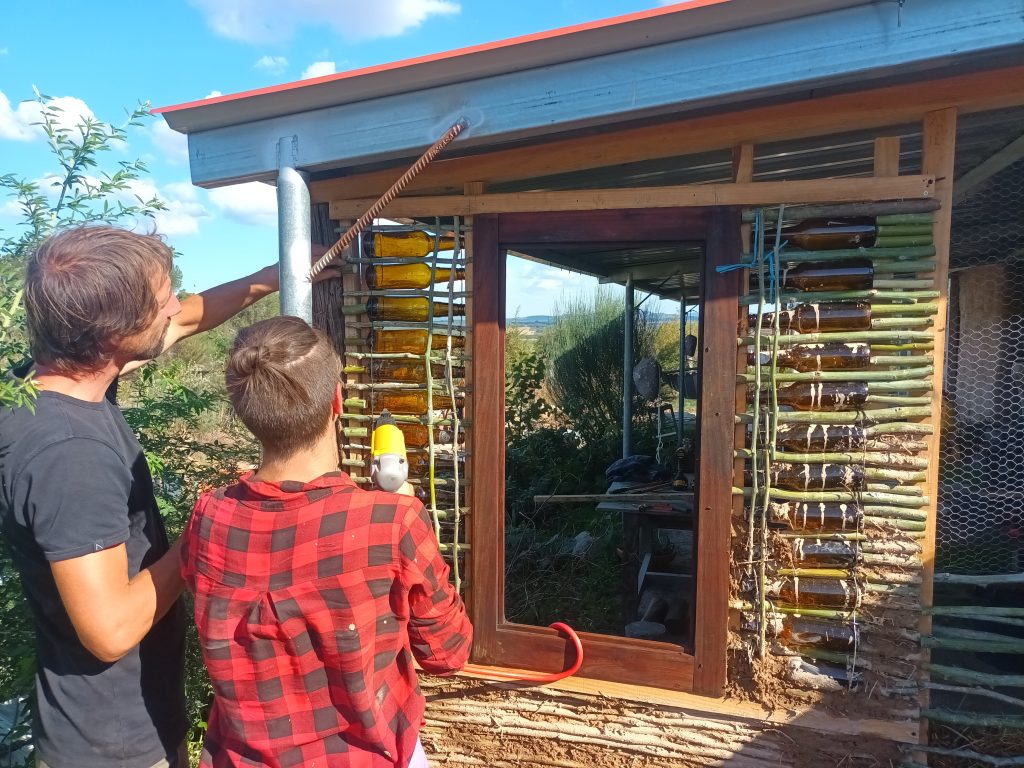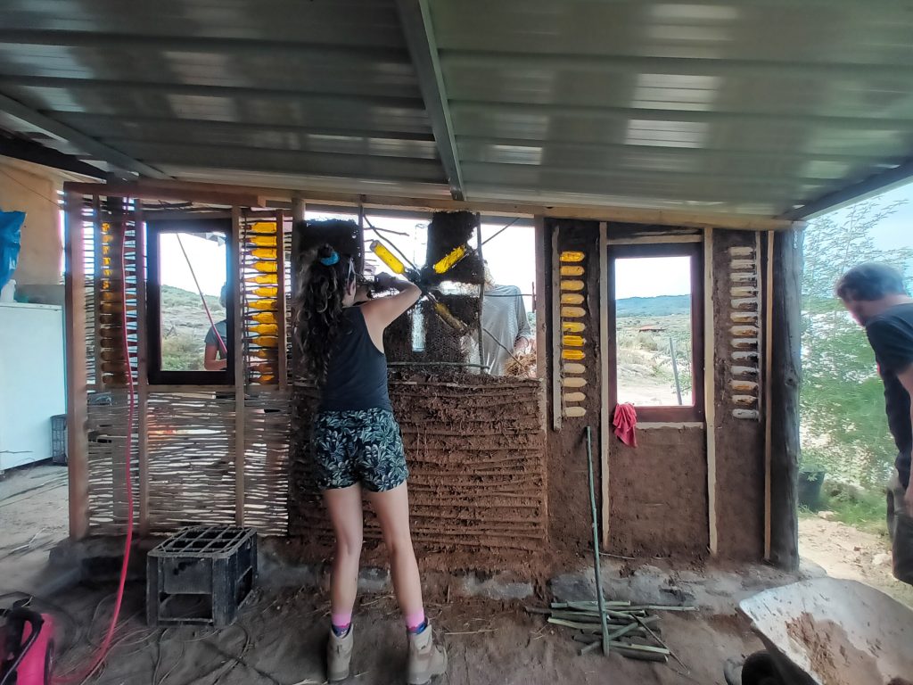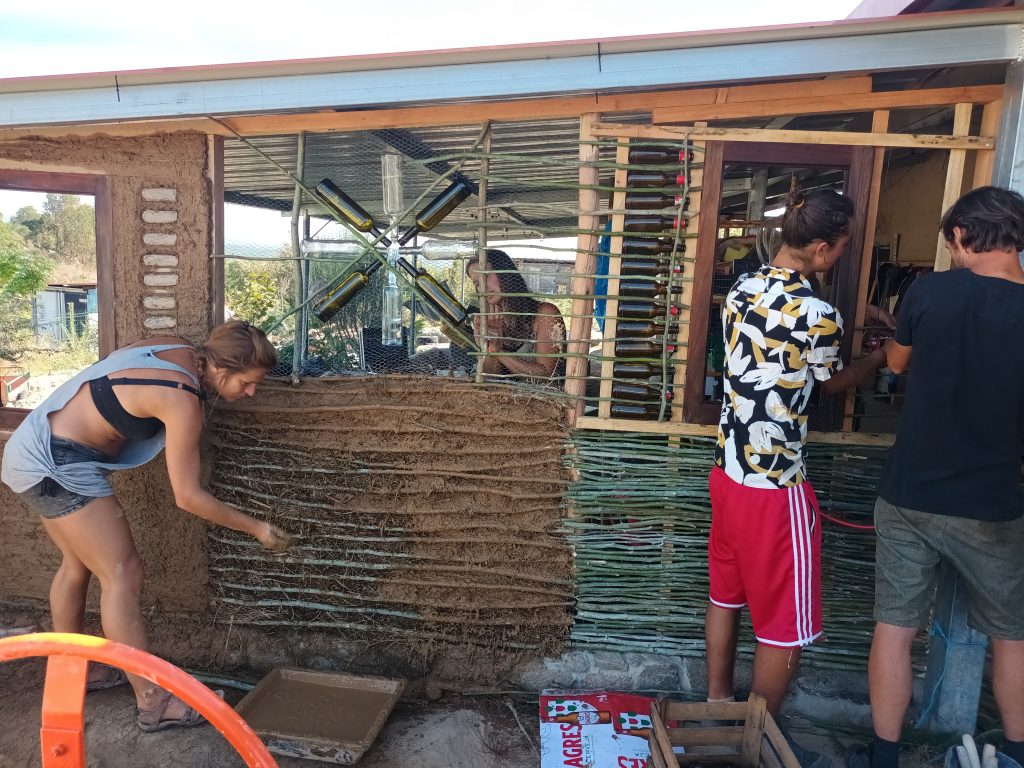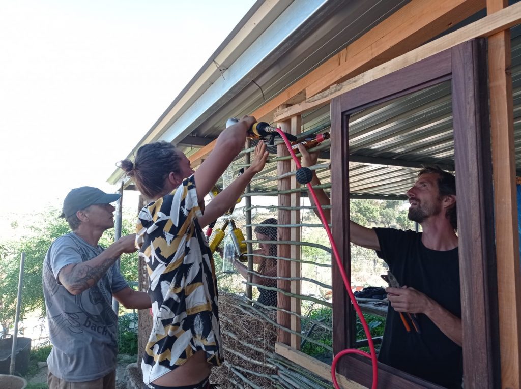This is the fastest natural building method. It uses Mimosa from our land as wattle (wooden supports for clay), earth from our land as plaster and old bottles for effect. Here the centre wall is double wattle and daub with an insulated centre. On the sides are the more standard single wattle and daub, which gives a thinner wall without insulation.