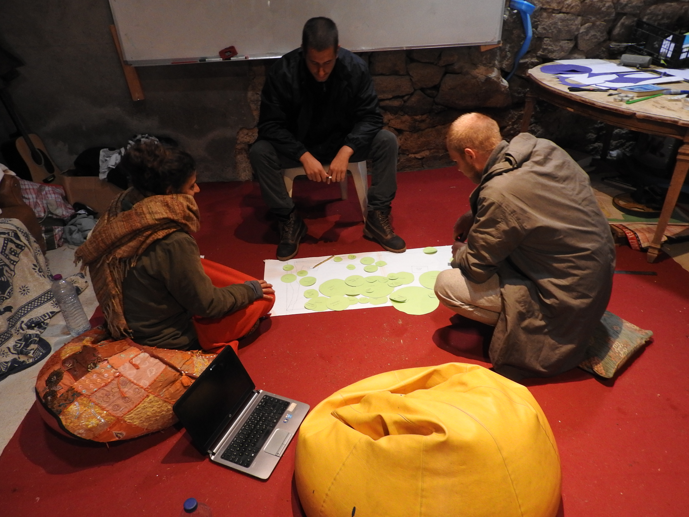 Redrawing the map of the food forest on paper by the containor which has a new map of our land