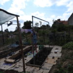 - Place the wooden forms in place and secure by screwing them into a wooden stake in each corner and middle of the bed. We made sure that the top of the form was level and goes 5cm above the level of the paths to allow for future mulch in the paths. If the planks were too thin they did not function too well as the path fell into the bed under the planks. We don’t have any slugs or snails here but these wooden forms may attract them if you do. Also we learnt from the first beds that placing cardboard along the sides of the beds and folding them into the paths saves on removing weeds later, so we did this for the last three beds.